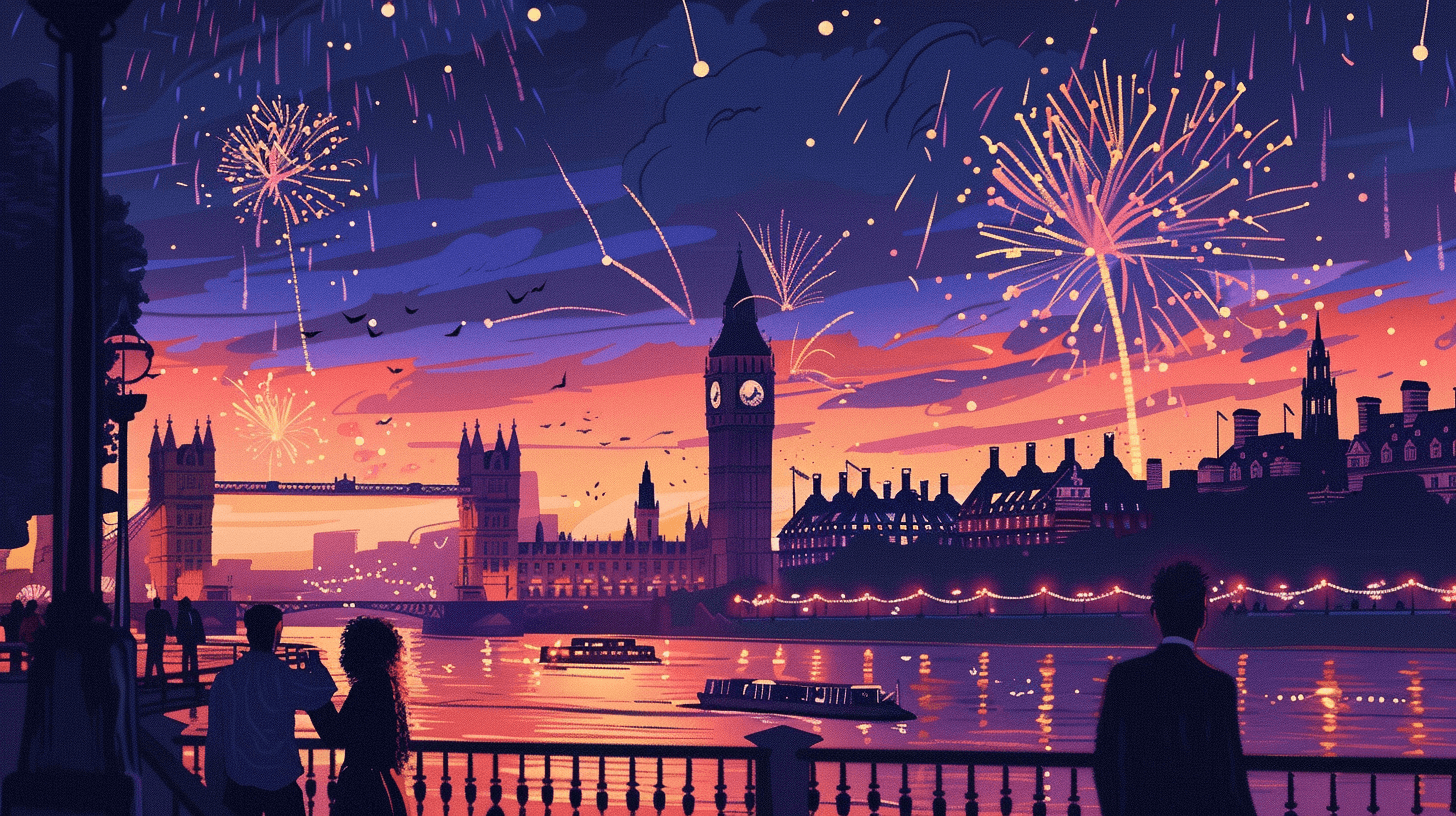 London’s main countdown takes place along the Thames and is ticketed, with fireworks launched at midnight. Viewing areas open in the evening, and the event runs past midnight.